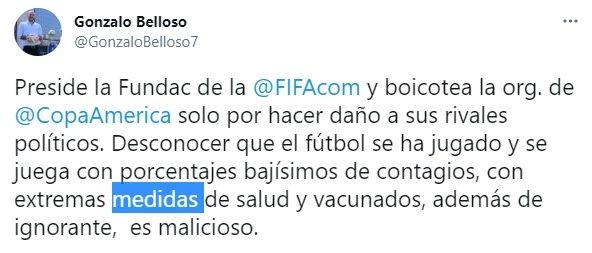"Preside la Fundación de la FIFA y boicotea la organización de la Copa América sólo para hacer daño a sus rivales políticos. Desconocer que el fútbol se ha jugado y se juega con porcentajes bajísimos de contagios, con extremas medidas de salud y vacunados, además de ignorante, es malicioso", escribió Belloso en su cuenta de Twitter.