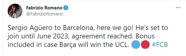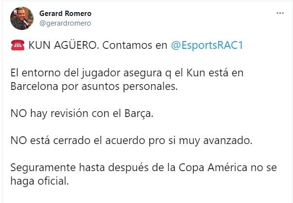 Gerard Romero, de Esports RAC1, escribió en las redes sociales que su visita es por temas personales y no confirmó que su arribó al culé este cerrado: "El entorno del jugador asegura q el Kun está en Barcelona por asuntos personales. NO hay revisión con el Barça. NO está cerrado el acuerdo pro si muy avanzado. Seguramente hasta después de la Copa América no se haga oficial".