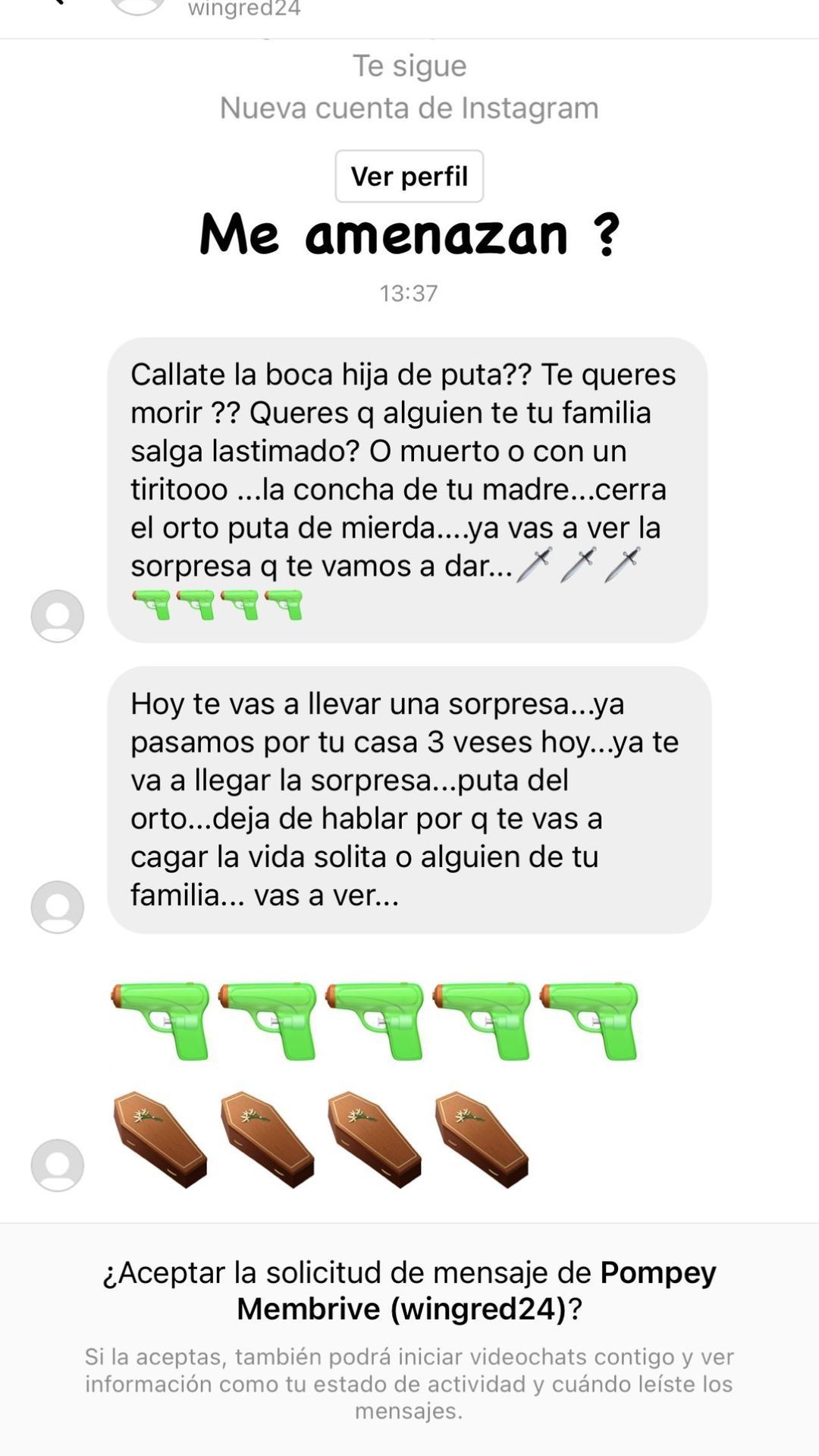 "¿Te quieres morir? ¿Quieres que alguien de tu familia salga lastimado o muerto con un tiro? (…) Ya pasamos por tu casa tres veces hoy, ya te va a llegar la sorpresa. Dejá de hablar, te vas a cagar la vida solita o alguien de tu familia... vas a ver", agregó y colocó emoticones de armas y ataúdes para cerrar la cobarde amenaza.