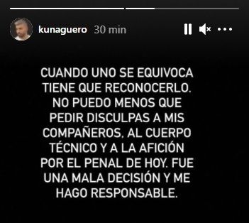 Luego del partido, Sergio Agüero se expresó en Instagram y pidió disculpas por lo ocurrido. "Cuando uno se equivoca tiene que reconocerlo. No puedo menos que pedir disculpas a mis compañeros, al cuerpo técnico y a la afición por el penal de hoy. Fue una mala decisión y me hago responsable", escribió el Kun.