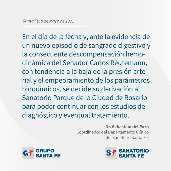 Desde el sanatorio de la capital provincial, actualizaron el parte médico este sábado: "Ante la evidencia de un nuevo episodio de sangrado digestivo y la consecuente descompensación hemodinámica del Senador con tendencia a la baja de la presión arterial y el empeoramiento de los parámetros bioquímicos, se decide su derivación a Rosario".