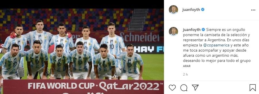 El defensor Juan Foyth, quien se quedó afuera de la lista del seleccionado argentino para la Copa América 2021, publicó un mensaje de apoyo a sus compañeros.