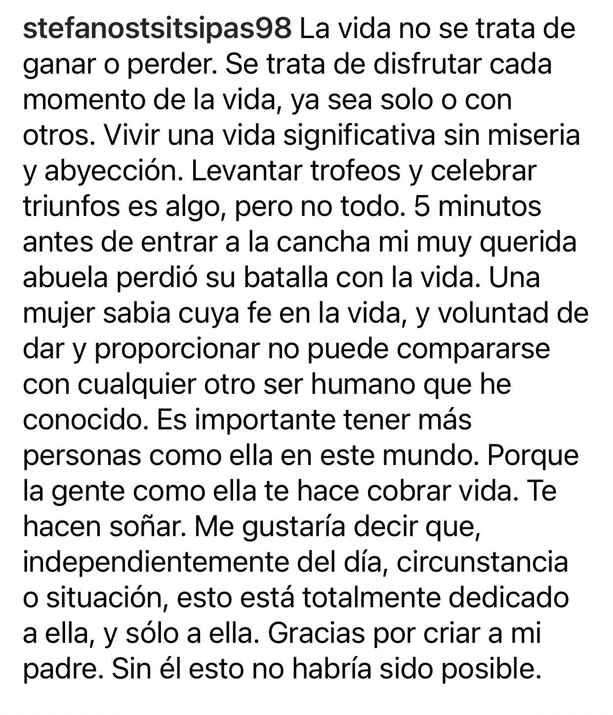 Stefanos Tsitsipas (5°) cayó en la final de Roland Garros ante Novak Djokovic. Jugaron un maratónico partido, donde el griego estuvo dos sets arriba, pero no pudo cerrar el duelo y el número uno se lo ganó. Horas después del tremendo golpe, se pronunció en las redes sociales y reveló que "cinco minutos" antes de salir a la cancha se entero del fallecimiento de su abuela.