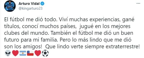 "El fútbol me dio todo. Viví muchas experiencias, gané títulos, conocí muchos países", inició su mensaje el mediocampista del Inter de Milan, y continuó con un particular elogio hacia el "10": "Jugué en los mejores clubes del mundo. También el fútbol me dio un buen futuro para mi familia. ¡Pero lo más lindo que me di son los amigos! ¡Qué lindo verte siempre, extraterrestre!".