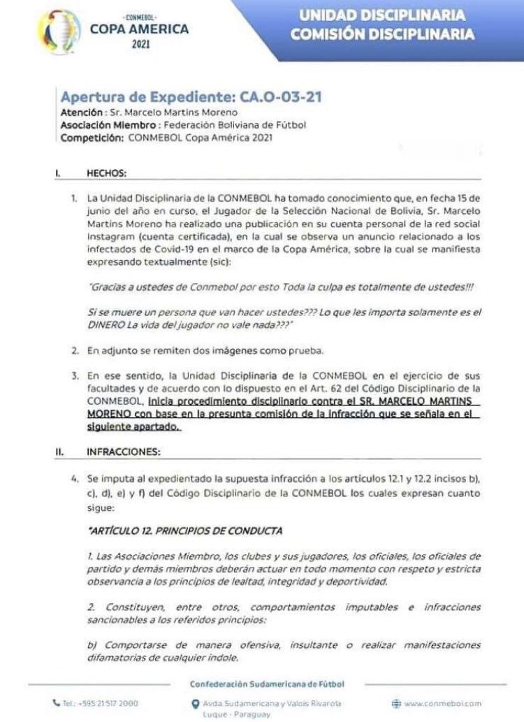 El referente de la selección boliviana de fútbol Marcelo Moreno Martins podría enfrentar una sanción de parte de la Conmebol por las duras críticas que lanzó hacia la organización de la Copa América en Brasil durante la pandemia de coronavirus. La Unidad Disciplinaria abrió un expediente contra el delantero de "La Verde" y le otorgó un plazo para presentar alegatos y pruebas.