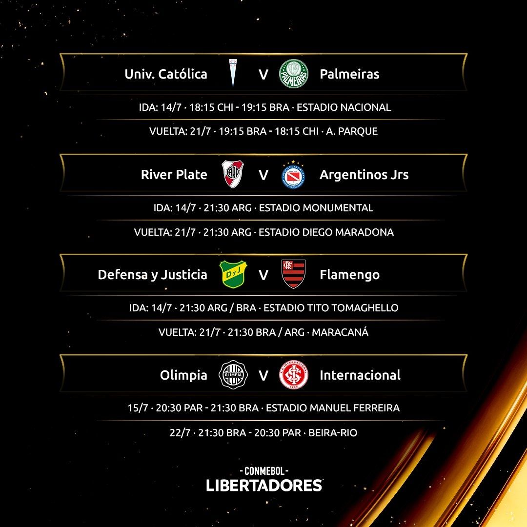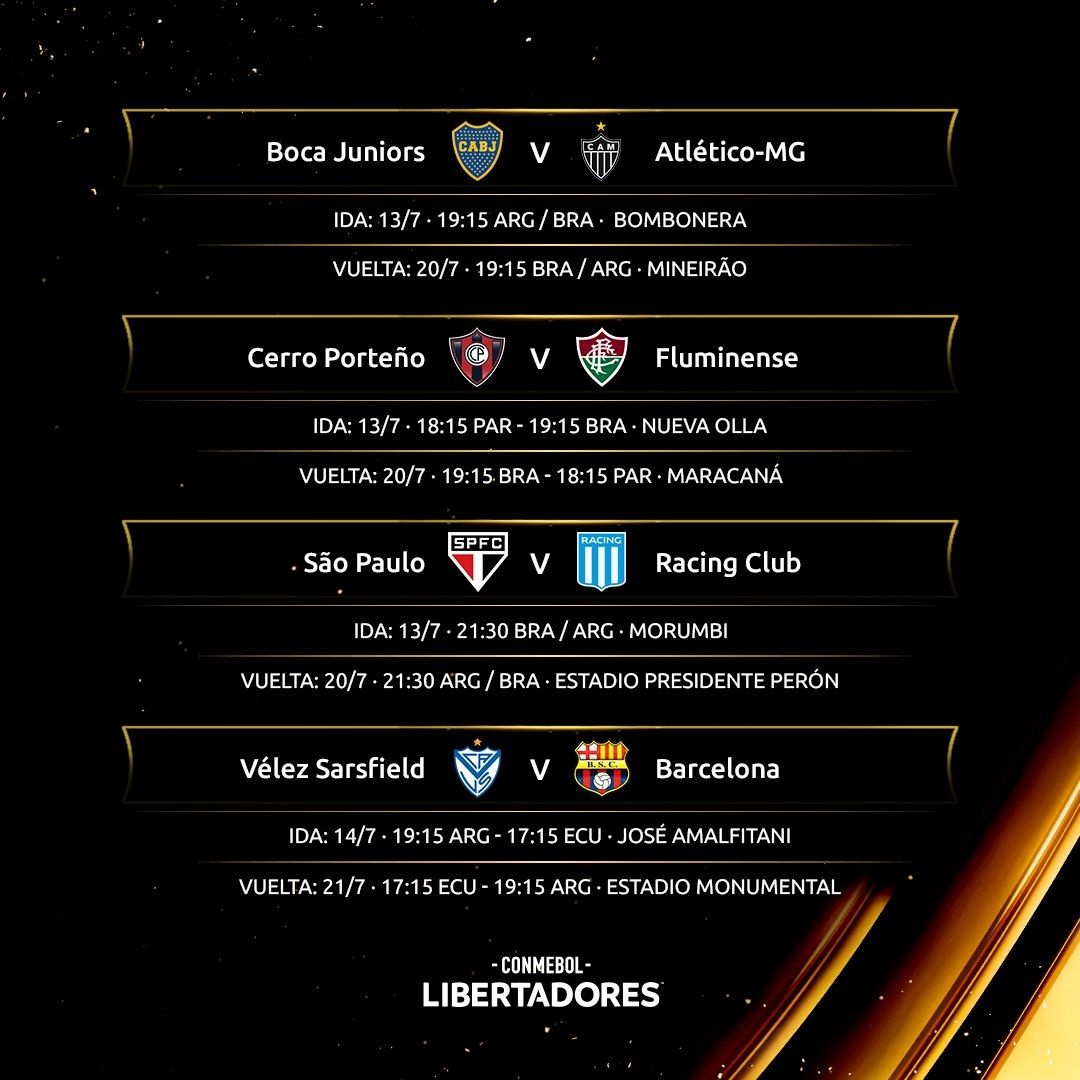 Los desquites de los duelos antes mencionados se disputarán a partir del martes 20. Ese día Mineiro y Boca jugarán a las 19.15 y Racing cerrará el duelo con San Pablo en su estadio, a las 21.30. El miércoles 21, Barcelona y Vélez se medirán a las 19.15 y a las 21.30, en simultáneo, chocarán Argentinos Juniors-River y Flamengo-Defensa y Justicia.