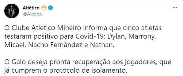 Atlético Mineiro, uno de los animadores del certamen brasileño, disputará los octavos de final de la Copa Libertadores de América ante Boca Juniors, en sendos cruces que se llevarán a cabo los días martes 13 y 20 de julio. Los otros futbolistas que también dieron positivo son Dylan, Marrony, Micael y Nathan.