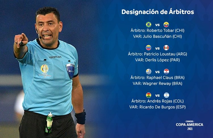 Para este domingo, el encargado de impartir justicia en Brasil-Ecuador será el chileno Roberto Tobar, mientras que en el VAR estará su compatriota Julio Bascuñán. El otro duelo que cerrará el Grupo B será Venezuela-Perú, con el argentino Patricio Loustau como principal y el paraguayo Derlis López en el VAR.