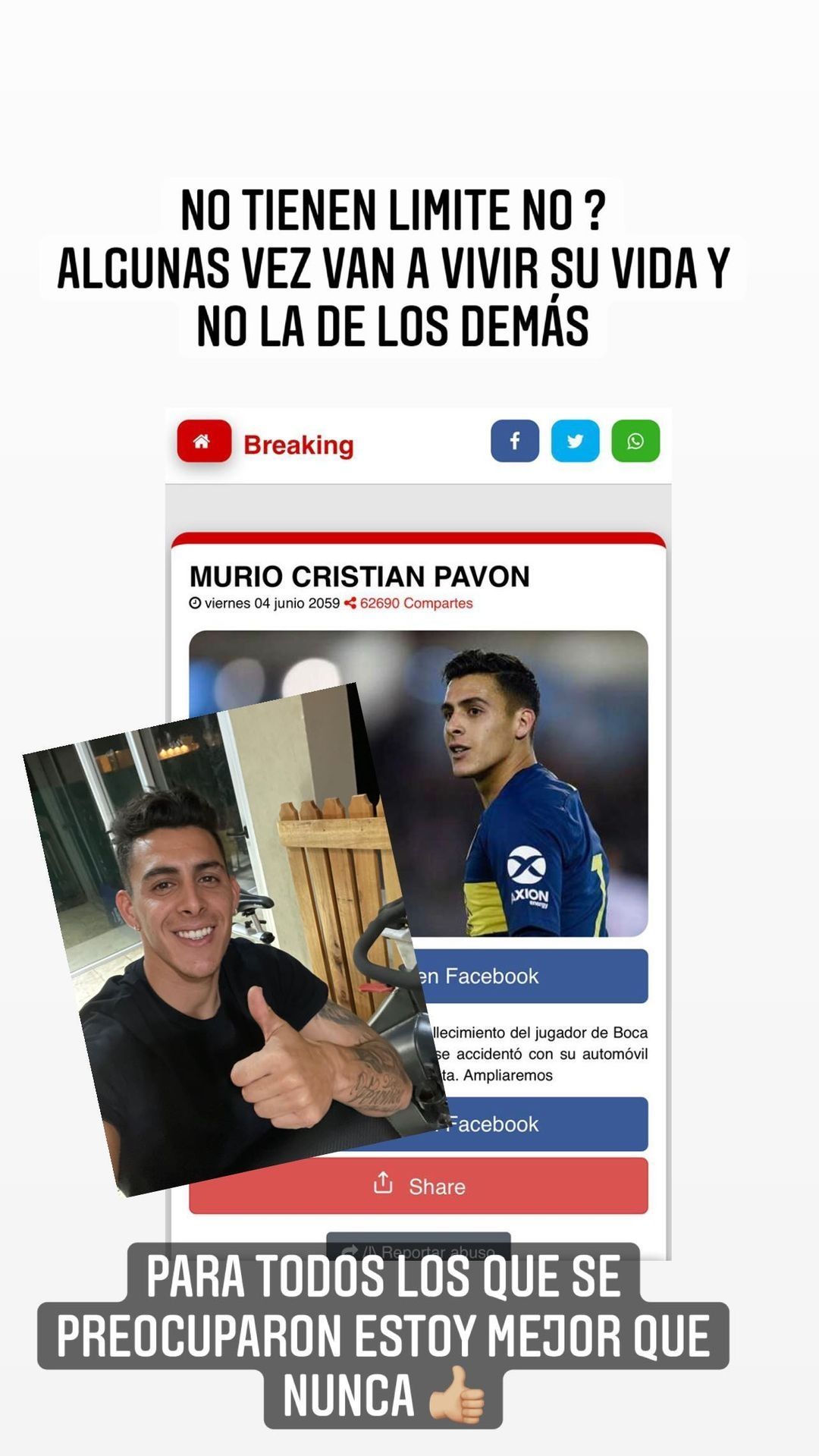 Cristian Pavón vivió un confuso momento. En las últimas horas se viralizó una información falsa sobre su fallecimiento, que el propio jugador de Boca se encargó de desmentir en Instagram. "No tienen límite, ¿no? ¿Alguna vez van a vivir su vida y no la de los demás? Para todos los que se preocuparon, estoy mejor que nunca”, escribió Kichán junto a una foto suya sonriente.