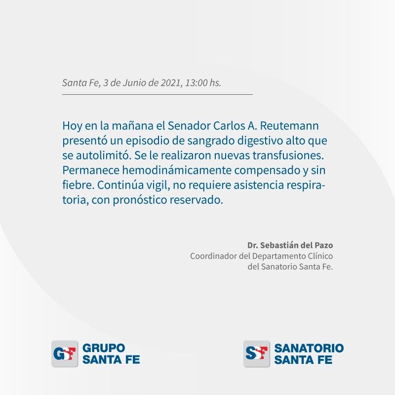 "Hoy en la mañana el Senador Carlos A. Reutemann presentó un episodio de sangrado digestivo alto que se autolimitó. Se le realizaron nuevas transfusiones. Permanece hemodinámicamente compensado y sin fiebre. Continúa vigil, no requiere asistencia respiratoria, con pronóstico reservado", expresa el comunicado.
