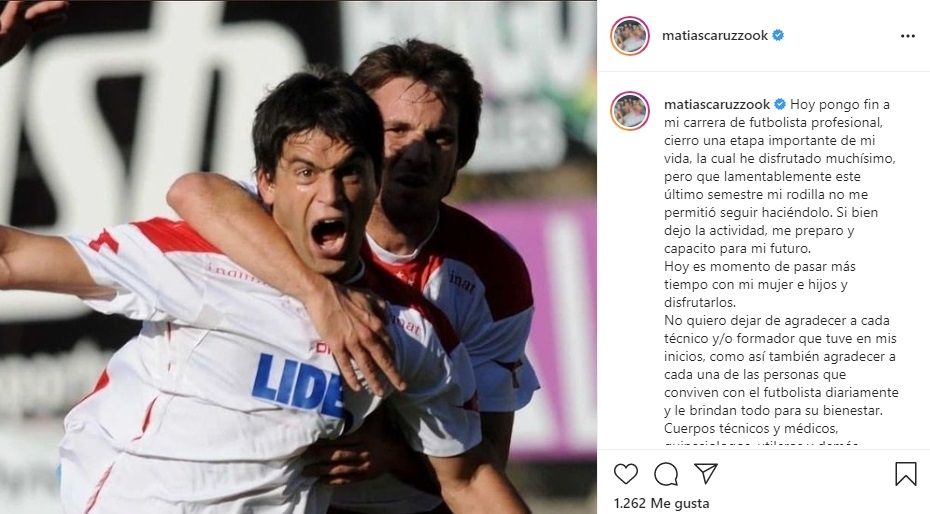 "Cierro una etapa importante de mi vida, la cual he disfrutado muchísimo, pero que lamentablemente este último semestre mi rodilla no me permitió seguir. Si bien dejo la actividad, me preparo y capacito para mi futuro. Hoy es momento de pasar más tiempo con mi mujer e hijos y disfrutarlos", lamentó Caruzzo en la publicación.