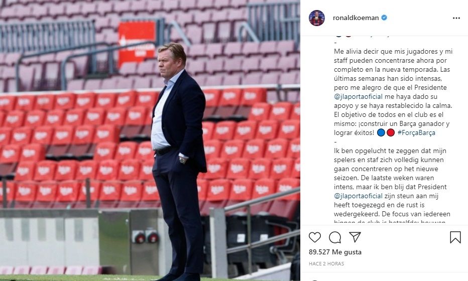 Y agregó: "Las últimas semanas han sido intensas, pero me alegro de que el presidente Laporta me haya dado su apoyo y se haya restablecido la calma", aseguró en sus redes. En la misma publicación, el técnico neerlandés asegura que sus retos son los mismos que los del club. "El objetivo de todos en el club es el mismo: construir un Barça ganador y lograr éxitos", apostilló.