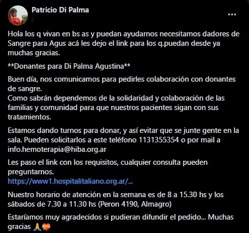 Sin embargo, al parecer, su cuadro sufrió alguna complicación en las últimas horas y en las redes sociales se armó una gran movida para solicitar dadores de sangre para Agustina. Tanto Patricio, como su abuela Tana y otros tantos del ambiente del Turismo Carretera, hicieron circular el pedido y colmaron la publicación de mensajes de apoyo para la familia arrecifeña.