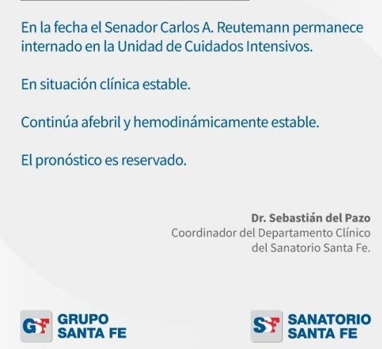 El senador nacional, y ex piloto de Fórmula 1, Carlos Reutemann continúa internado en un sanatorio privado de la ciudad de Santa Fe, a raíz de los reiterados sangrados digestivos que padece.