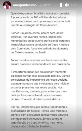 Por último, recordamos que somos trabajadores, profesionales del fútbol. Tenemos una misión que cumplir con la histórica camiseta verde y amarilla pentacampeona del mundo. Estamos en contra de la organización de la Copa América, pero nunca le diremos que no a la Selección Brasileña".