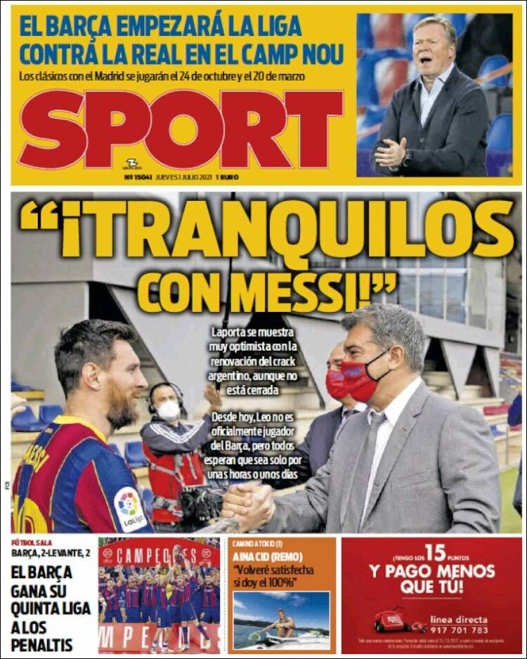 "¡Tranquilos con Messi!", tituló el diario catalán Sport, citando una frase del presidente Joan Laporta. Según el citado medio, "Laporta se muestra muy optimista con la renovación del crack argentino, aunque no está cerrada". Además, Sport recalca que "desde hoy, Leo no es oficialmente jugador del Barça pero todos esperan que sea solo por unas horas o unos días".