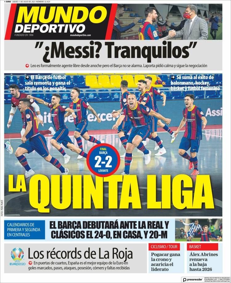 El otro diario con peso en Cataluña, Mundo Deportivo, también acudió a las palabras de Laporta y tituló "¿Messi? Tranquilos", agregando que "Leo es formalmente agente libre desde anoche pero el Barça no se alarma. Laporta pidió calma y sigue la negociación". De todas maneras, para este medio no fue la noticia principal y la tapa la protagoniza el equipo de futsal del Blaugrana, que ganó La Liga en la disciplina.