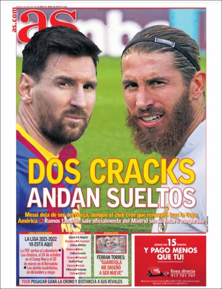 En Madrid la noticia no pasó desapercibida y el diario As le dedicó su portada tanto a Messi como a Sergio Ramos, quien hoy también pasó a ser agente libres. "Dos cracks andan sueltos", fue el título de tapa del medio madrileño. "Messi deja de ser del Barça, aunque el club cree que renovará tras la Copa América", destaca, y agrega que "Ramos también sale oficialmente del Madrid sin su futuro asegurado".