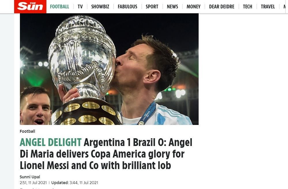 El periódico The Sun, de Inglaterra, compartió: "Angel Di Maria entrega la gloria de la Copa América a Lionel Messi y compañía con un globo brillante".