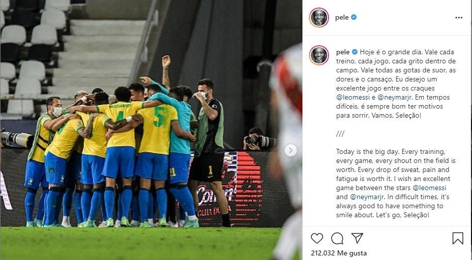 El astro brasileño Pelé, tricampeón del mundo en 1958, 1962 y 1970, deseó hoy que Lionel Messi y Neymar tengan “un buen juego” en la final de la Copa América en el estadio Maracaná. "En tiempos difíciles, siempre es bueno tener motivos para sonreír. ¡Vamos, 'Seleçao'!", puso el astro en un breve mensaje de Instagram , que acompañó con una foto del equipo brasileño y otra de "Ney".