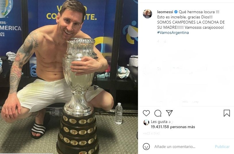 "¡¡¡Qué hermosa locura!!! ¡¡¡Esto es increíble, gracias Dios!!! ¡¡¡¡¡¡SOMOS CAMPEONES LA CONCHA DE SU MADRE!!!!!! ¡Vamossss carajooooo! Vamos Argentina”, escribió el "10" y revolucionó al mundo del fútbol. El posteo, hasta el momento, acumula más de 19.400.000 "me gusta" y en las próximos días o semana podría romper otro hito.