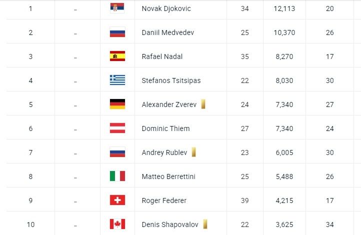 Los diez primeros puestos se ordenan de la siguiente manera: 1) Novak Djokovic (Serbia); 2) Daniil Medvedev (Rusia); 3) Rafael Nadal (España); 4) Stefanos Tsitsipas (Grecia); 5) Alexander Zverev (Alemania); 6) Dominic Thiem (Austria); 7) Andrey Rublev (Rusia); 8) Matteo Berrettini (Italia); 9) Roger Federer (Suiza) y 10) Denis Shapovalov (Canadá).
