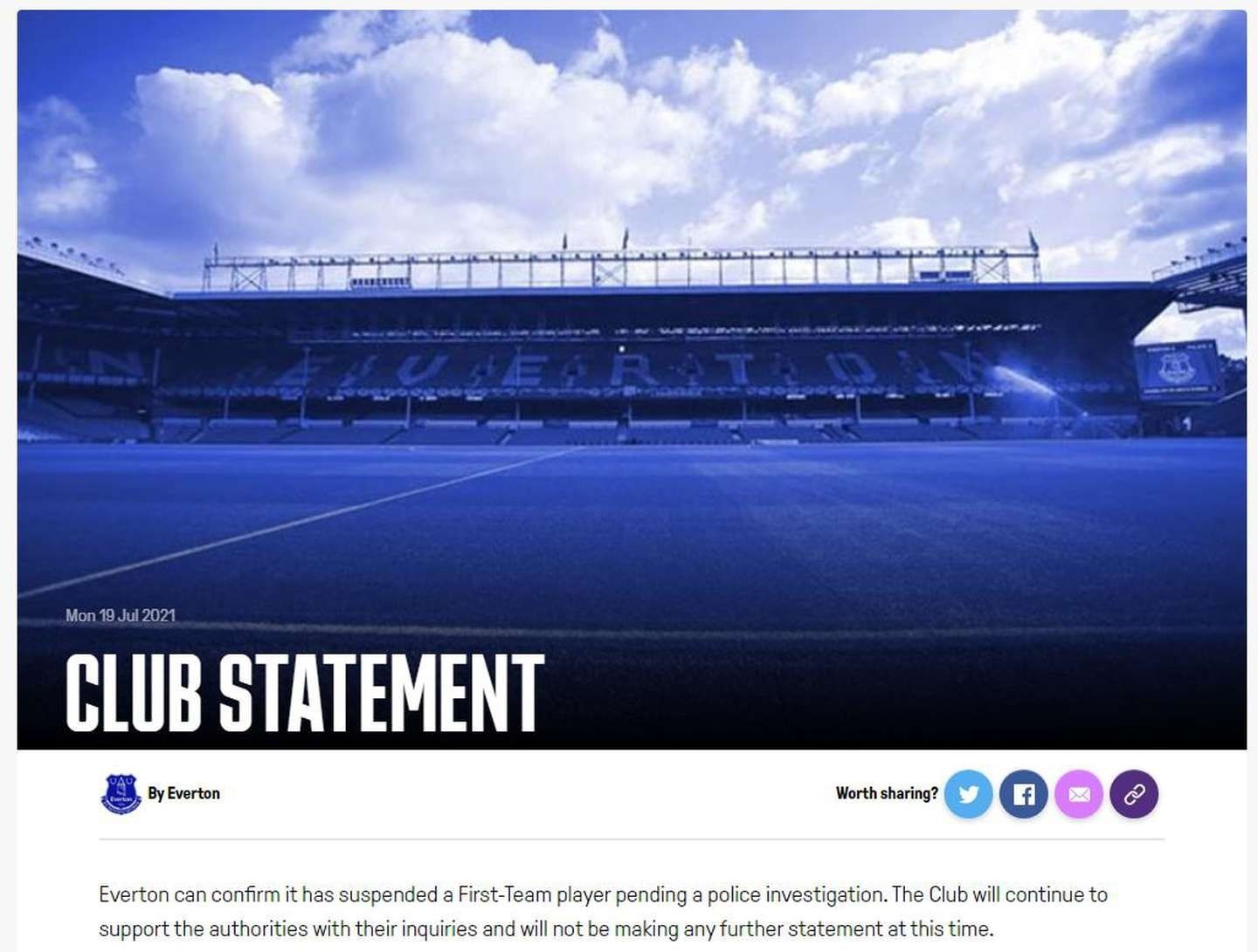 "Los agentes arrestaron a un hombre el viernes 16 de julio de 2021 bajo sospecha de delitos sexuales contra menores. Está bajo fianza policial a la espera de nuevas investigaciones", indicó. Por su parte, el Everton que dirige Rafa Benítez emitió un comunicado en el que informaba de la suspensión de uno de sus futbolistas por la investigación policial que pesaba sobre él.