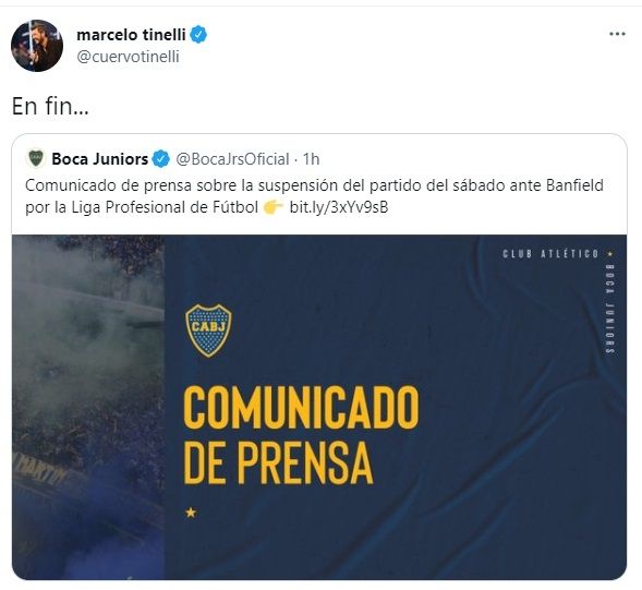 Sin embargo, con el transcurso del día se comenzó a hablar de una desmentida a esta situación que mencionaba Boca y el propio Tinelli publicó un sugerente tuit respondiendo el comunicado que sacó el Xeneize utilizando un simple "en fin". Voceros de la LPF adelantaron que la Mesa Directiva de la entidad se reunirá mañana para rechazar el pedido de Boca.
