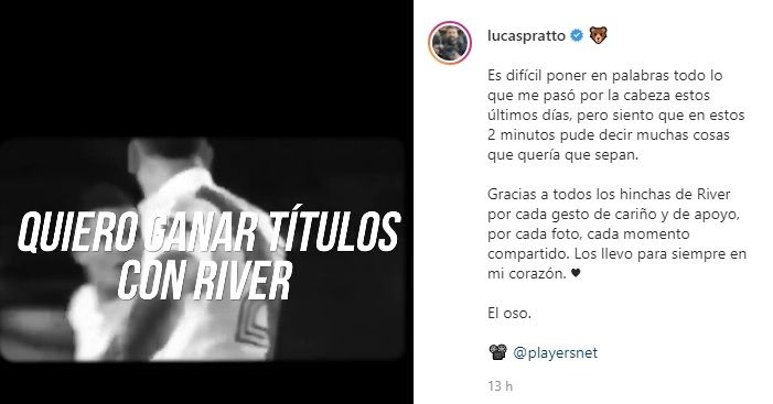 En su cuenta personal de Instagram, el Oso Pratto compartió un conmovedor video en el que intenta describir su paso por el club. Si bien en el escrito advirtió que "es difícil poner en palabras todo lo que me pasó por la cabeza estos últimos días", luego aclaró: "Pero siento que en estos 2 minutos pude decir muchas cosas que quería que sepan. Gracias a todos los hinchas de River por cada gesto de cariño y de apoyo, por cada foto, cada momento compartido. Los llevo para siempre en mi corazón".