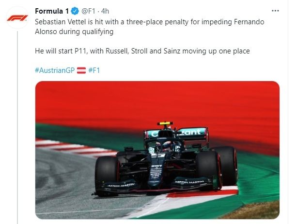 Sebastian Vettel (Aston Martin), que finalizó octavo en la calificación para el Gran Premio de Austria, fue sancionado con la pérdida de tres puestos en parrilla por "entorpecer a Fernando Alonso en su vuelta", dice el texto que ha compartido la Fórmula 1 en redes sociales.