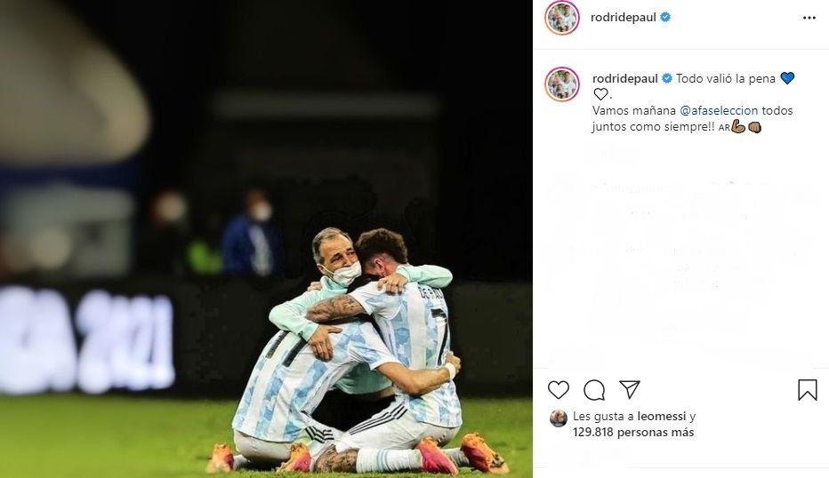 Rodrigo De Paul, una de las piezas clave para Lionel Scaloni en la Selección Argentina, escribió un sentido mensaje en su cuenta de Instagram a horas para la gran final de la Copa América entre Brasil y Argentina. "Todo valió la pena. Vamos mañana Selección todos juntos como siempre!!".