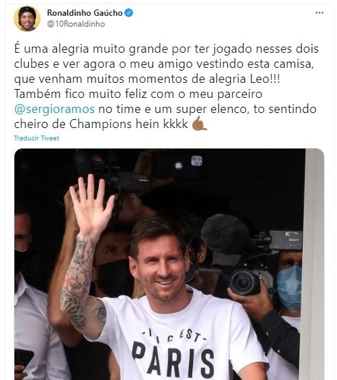"Es una alegría muy grande haber jugado en esos dos clubes [PSG y Barcelona] y ahora ver a mi amigo vistiendo esta camisa, ¡que vengan muchos momentos de alegría, Leo!", expresó Ronaldinho en su cuenta en Twitter. Ronaldinho y Messi coincidieron en Barcelona entre el 2004, cuando el argentino debutó, y en 2008, cuando el brasileño pasó al Milan.