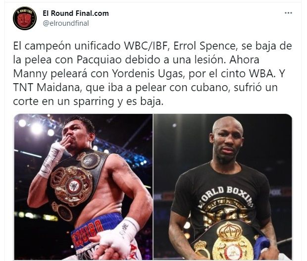 Sebastián Contursi, manager de Maidana, publicó un tuit, reproducido por la página especializada El Round Final: "La vida, llena de ironías. Después de que le conseguimos una chance de oro contra Ugas, Fabián Maidana sufrió un serio corte en un sparring que lo dejó fuera de la pelea. Hoy, Errol Spence queda fuera de la pelea con Pacquiao. Ahora tenemos Pac vs. Ugas. Loco boxeo".