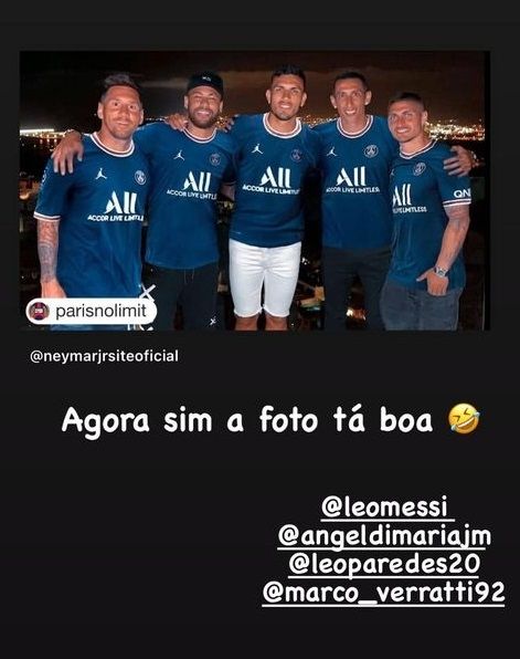Con la frase "ahora sí la foto está buena", más un emoji de carcajada y los cinco vestidos con la ropa parisina, Ney la compartió en su historia y enloqueció a todos. La cuenta "Neymar Jr Site Oficial", de la popular red social, lo incluyó en sus publicaciones y roza los 200 mil likes en pocas horas.