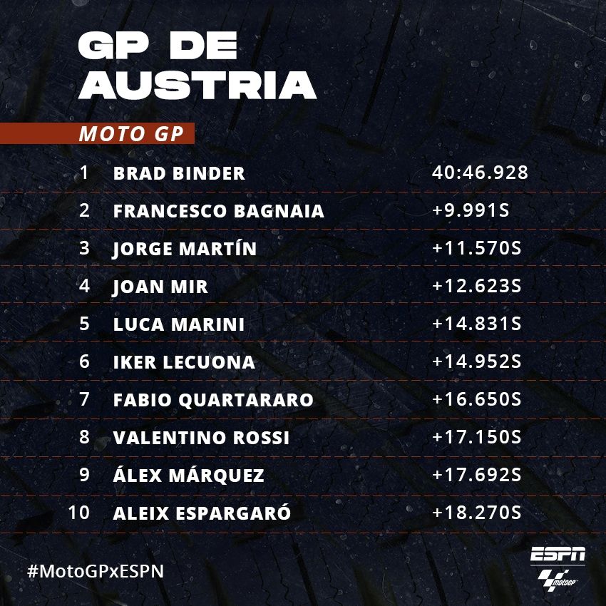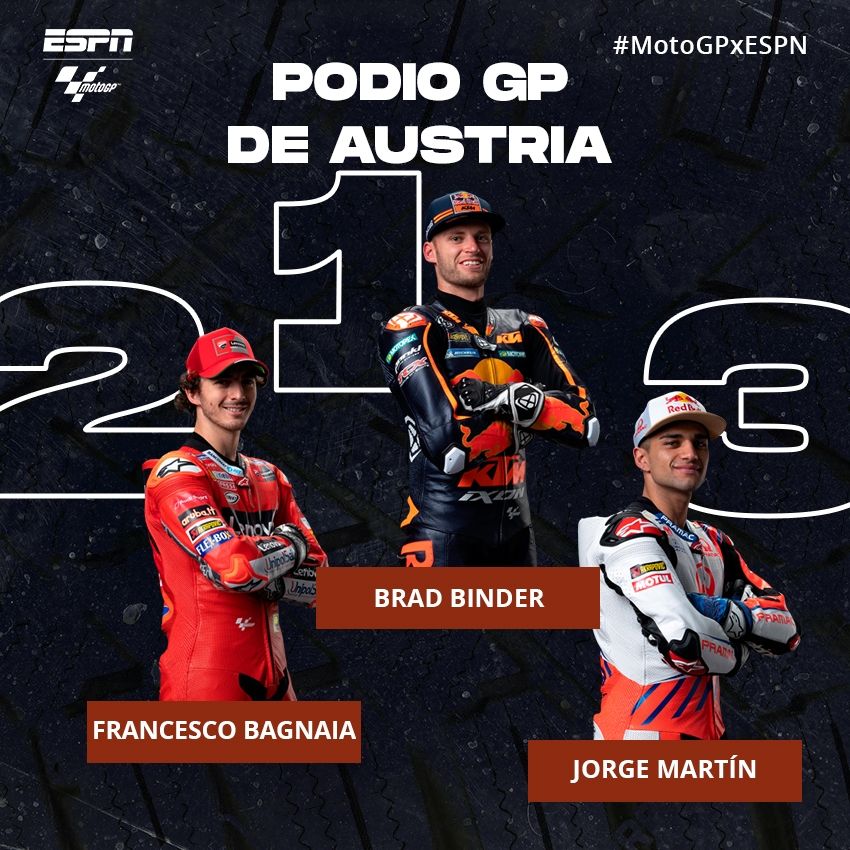 Brad Binder (KTM RC 16) se anotó una agónica victoria en el Gran Premio de Austria de MotoGP en el circuito Red Bull de Spielberg, por delante del italiano Francesco Pecco Bagnaia (Ducati Desmosedici GP21) y del español Jorge Martín (Ducati Desmosedici GP21).