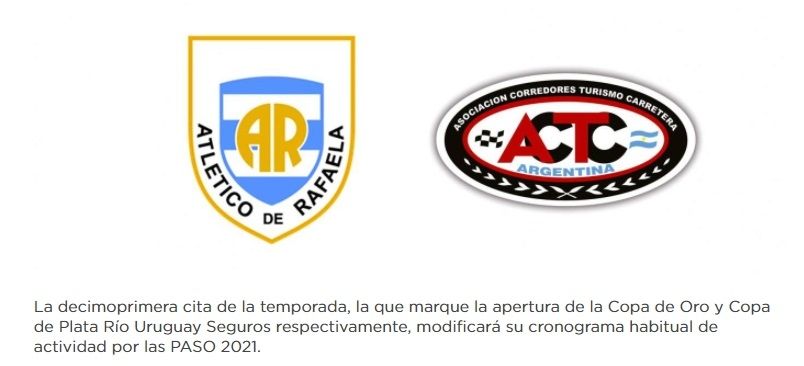 El anuncio fue realizado mediante un comunicado en la web oficial de la categoría: "La decimoprimera cita de la temporada, la que marque la apertura de la Copa de Oro y Copa de Plata Río Uruguay Seguros respectivamente, modificará su cronograma habitual de actividad por las PASO 2021".