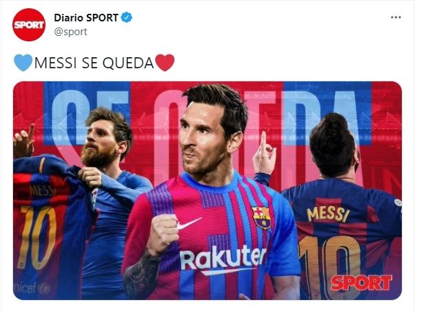 Sin embargo, el Diario Sport tiró la bomba en las redes sociales. Realizó una publicación con varias fotos del astro argentino y la frase "Messi se queda", acompañada de un corazón azul y otro rojo. Además, en su sitio online escribió un artículo que tituló: "¡Acuerdo total Barça-Messi!" y escribió: "Las negociaciones que se han desarrollado en los últimos meses se han cerrado".