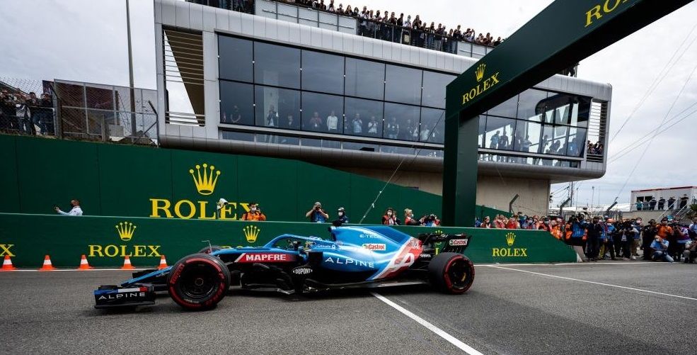 Fernando empezó a apretar el acelerador de su coche para dar caza al resto de los Alpine. En las curvas Porsche los adelantó para empezar a rodar primero y el giro terminó en una formación junto a ellos, para escuchar una nueva ovación.