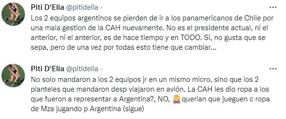 A través de Twitter, la Piti apuntó a una "mala gestión de la CAH". "No es el presidente actual, ni el anterior, ni el anterior, es de hace tiempo y en todo". "No sólo mandaron a los dos equipos en un mismo micro, sino que los dos planteles que mandaron después viajaron en avión", agregó, en incluso denunció que la Confederación en un principio no les dio la indumentaria correspondiente y querían "que jueguen con ropa de Mendoza jugando para Argentina".