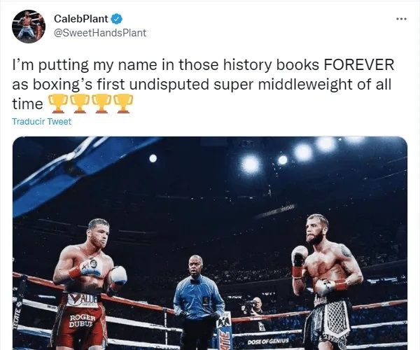 "Estaré poniendo mi nombre en esos libros de historia para siempre como el primer boxeador campeón indiscutible en la categoría de peso supermediano en todos los tiempos", se lee en el texto difundido por medio de la cuenta de @SweetHandsPlant. Además, acompañó la publicación con una fotografía intervenida donde él y Canelo Álvarez se encuentran encima del ring.