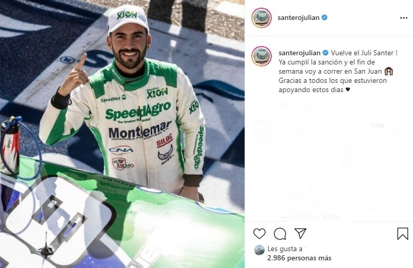 "Vuelve el Juli Santero! Ya cumplí la sanción y el fin de semana voy a correr en San Juan. Gracias a todos los que estuvieron apoyando estos días", escribió el piloto mendocino que buscará recuperar el terreno perdido ya que cayó al puesto 14 del campeonato y necesita quedar entre los doce para pelear por la corona.