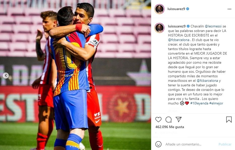El delantero optó por verbalizar públicamente todo el cariño que procesa a su amigo. Lo hizo en su cuenta de Instagram: "Chavalín @leomessi se que las palabras sobran para decir LA HISTORIA QUE ESCRIBISTE en el @fcbarcelona . El club que te vio crecer, el club que tanto querés y tantos títulos lograste hasta convertirte en el MEJOR JUGADOR DE LA HISTORIA".
