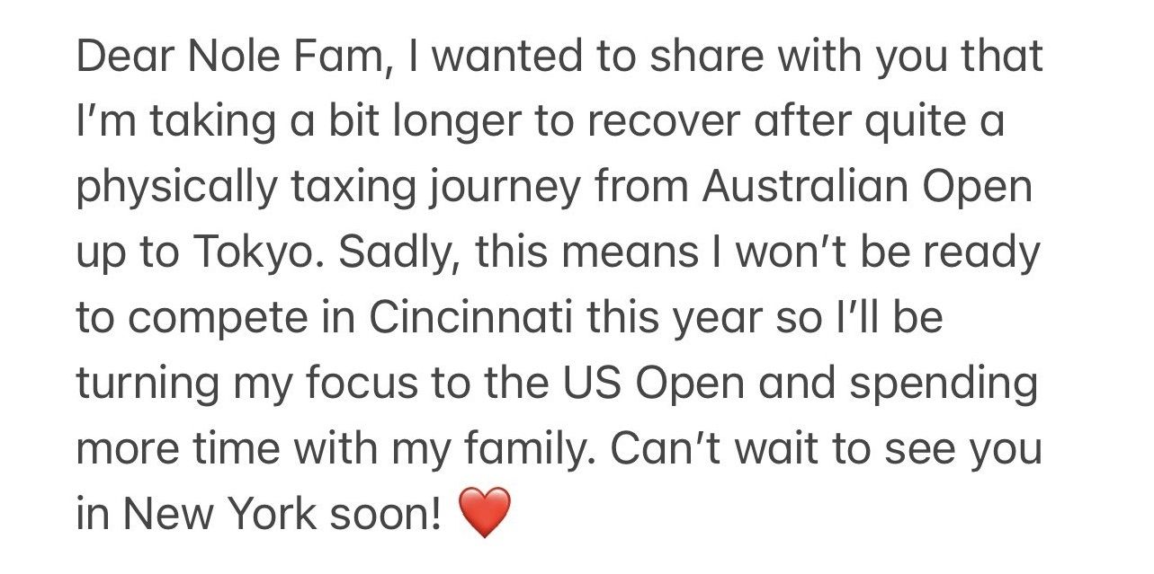 "Queridos fans, quería compartir con ustedes que me estoy tomando un poco más de tiempo para recuperarme después de un viaje bastante agotador desde Australia a Tokio. Lamentablemente, eso significa que no estaré listo para competir en Cincinnati este año, así que centraré mi atención en el US Open y pasaré más tiempo con la familia. ¡Nos vemos pronto en Nueva York!", escribió.