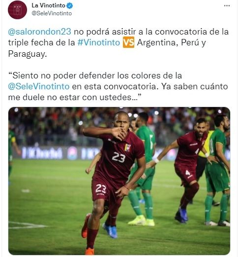Si bien el combinado que dirige Leonardo González no explicó los motivos, el delantero acaba de firmar con el equipo de la Premier League, liga que permitió que los equipos no cedan futbolistas. "Siento no poder defender los colores de la Vinotinto en esta convocatoria. Ya saben cuánto me duele no estar con ustedes", expresó el goleador.