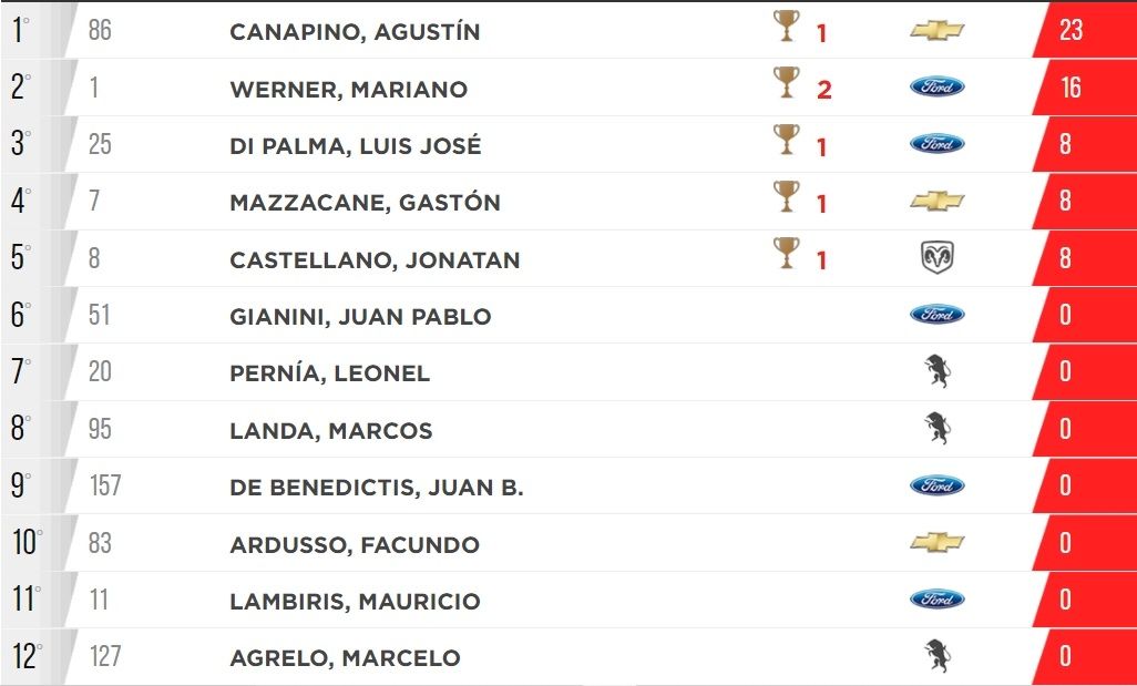 Del 11° al 15° aparecieron tres pilotos más que pertenecen al grupo que se debate el título: Gastón Mazzacane finalizó undécimo; Mariano Werner se ubicó decimotercero y Leonel Pernía decimocuarto. Las series del sábado de pondrán en marcha desde las 11.55 (Deportv), mientras que la final -que se disputará a 20 vueltas- iniciará a las 16 y se podrá ver por TV Pública.