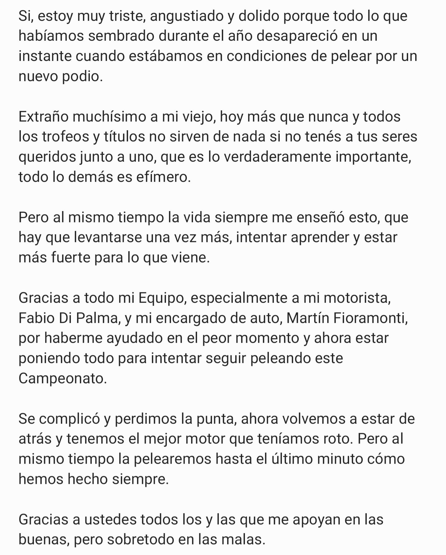 "Gracias a todo mi Equipo, especialmente a mi motorista, Fabio Di Palma, y mi encargado de auto, Martín Fioramonti, por haberme ayudado en el peor momento. Se complicó y perdimos la punta, ahora volvemos a estar de atrás y tenemos, el mejor motor, roto. Pero al mismo tiempo la pelearemos hasta el último minuto cómo hemos hecho siempre", cerró.