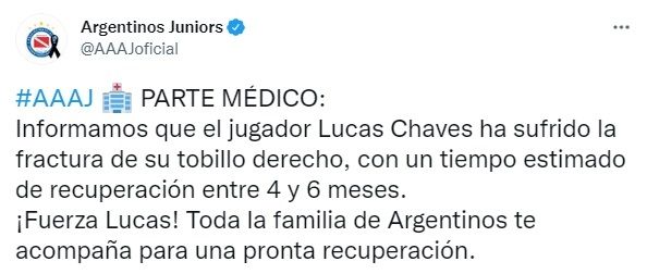 El guardavallas de Argentinos Juniors, Lucas Chaves, sufrió hoy una grave lesión, al retirarse del estadio Diego Maradona, con una fractura en el tobillo derecho, en el marco del partido que su equipo empató 1-1 con Patronato de Paraná.