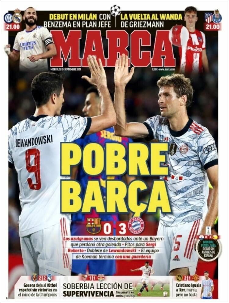Finalmente, el otro diario de Madrid, Marca, puso "Pobre Barça" en su portada principal y destacó que "los azulgranas se ven desbordados ante un Bayern que perdonó otra goleada. Pitos para Sergi Roberto. Doblete de Lewandowski. El quipo de Koeman termina con una guardería".