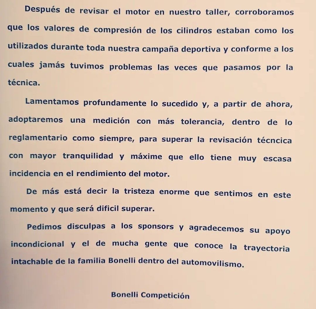"De más está decir la tristeza enorme que sentimos en este momento y que será difícil superar. Pedimos disculpas a los sponsors y agradecemos su apoyo incondicional y el de mucha gente que conoce la trayectoria intachable de la familia Bonelli dentro del automovilismo", cerró Bonelli que, además, fue citado por la CAF para declarar sobre lo sucedido.