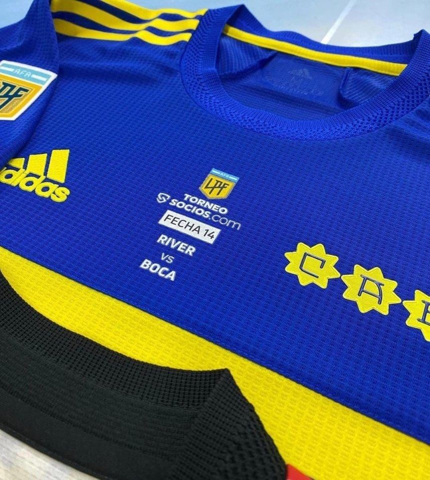 En la parte superior y central del frente de sus habitual indumentaria titular, se podrá observar el lema "River vs Boca", con el agregado de la fecha (14) del partido de la Liga Profesional levemente por encima.